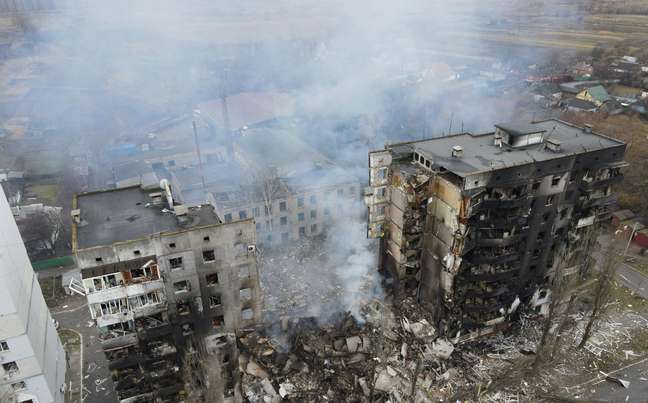 Dia 3/3 - Vista aérea de um prédio residencial destruído em região próxima a capital Kiev