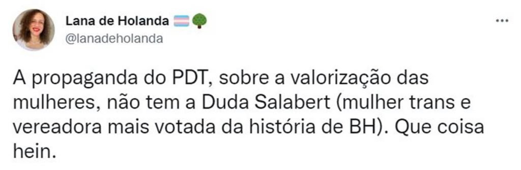 O Partido Democrático Trabalhista (PDT) deixou a vereadora trans Duda Salabert (PDT-MG) fora de duas campanhas sobre a participação de mulheres na política. Vídeos divulgados pelo partido do presidenciável Ciro Gomes trazem várias filiadas à sigla, mas deixaram de lado a vereadora mais votada da história de Belo Horizonte.